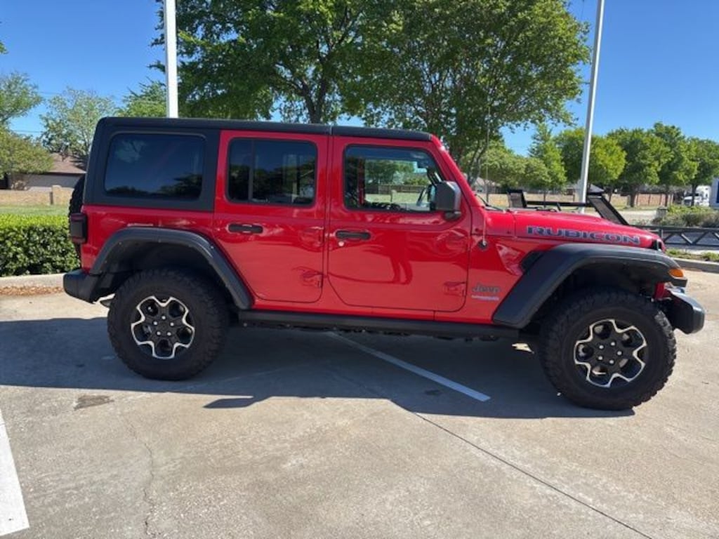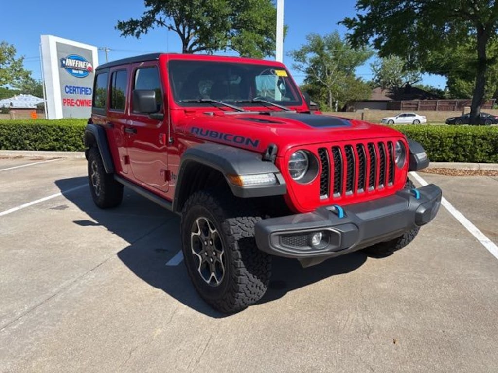 Certified. CARFAX One-Owner. Clean CARFAX. Firecracker Red Clearcoat 2022 Jeep Wrangler Unlimited Rubicon 4xe Unlimited Rubicon 4xe 8-Speed Automatic 2.0L I4 DOHC 4WD Cold Weather Group (Heated Front Seats, Heated Steering Wheel, and Remote Start System), Quick Order Package 29V, Trailer Tow & HD Electrical Group (7 & 4 Pin Wiring Harness, 700 Amp Maintenance Free Battery, Auxiliary Switches, and Class II Receiver Hitch), FCA US LLC Certified Pre-Owned Certified, 2.0L I4 DOHC, 4-Wheel Disc Brakes, 4.10 Rear Axle Ratio, 9 Speakers, ABS brakes, Air Conditioning, Alloy wheels, AM/FM radio: SiriusXM, Apple CarPlay/Android Auto, Auto-dimming Rear-View mirror, Automatic temperature control, Black 3-Piece Hard Top, Brake assist, Compass, Corning Gorilla Glass, Delay-off headlights, Driver door bin, Driver vanity mirror, Dual front impact airbags, Dual front side impact airbags, Electronic Stability Control, Emergency communication system: SiriusXM Guardian, Freedom Panel Storage Bag, Front anti-roll bar, Front Bucket Seats, Front Center Armrest w/Storage, Front dual zone A/C, Front fog lights, Front reading lights, Fully automatic headlights, Garage door transmitter, Heated door mirrors, Illuminated entry, Integrated roll-over protection, Leather steering wheel, Low tire pressure warning, MOPAR Hardtop Headliner, Navigation System, No Soft Top, Occupant sensing airbag, Outside temperature display, Panic alarm, ParkView Rear Back-Up Camera, Passenger door bin, Passenger vanity mirror, Performance Suspension, Power door mirrors, Power steering, Power windows, Premium Cloth Low-Back Bucket Seats, Radio data system, Radio: Uconnect 4C Nav w/8.4" Display, Rear anti-roll bar, Rear reading lights, Rear Window Defroster, Rear Window Wiper/Washer, Remote keyless entry, Security system, Speed control, Split folding rear seat, Steering wheel mounted audio controls, Tachometer, Telescoping steering wheel, Tilt steering wheel, Traction control, Trip computer, Variably intermittent wipers, Voltmeter, and Wheels: 17" x 7.5" Machined/Painted Black.