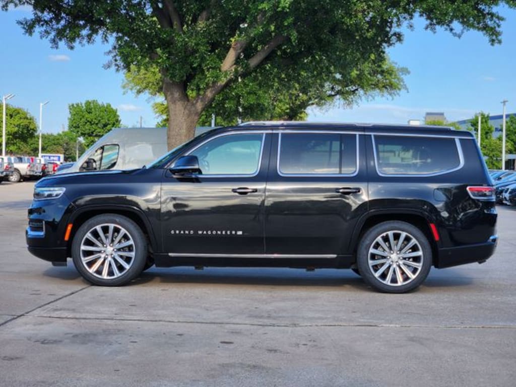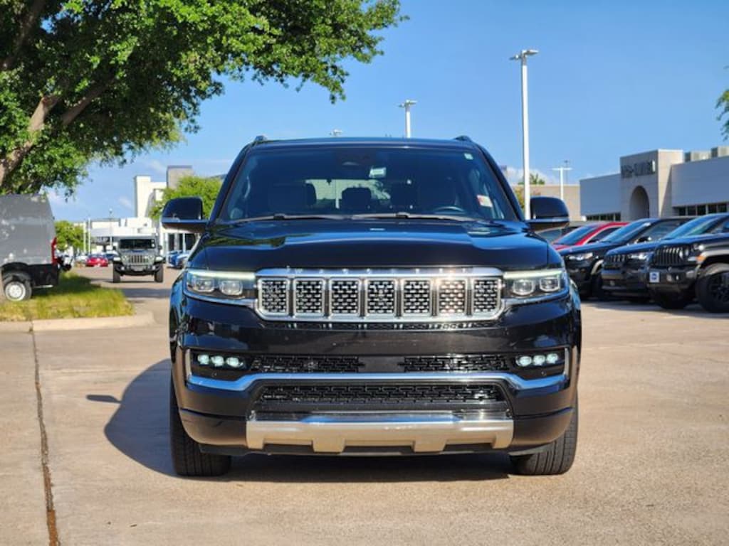 Certified. CARFAX One-Owner. Clean CARFAX. Diamond Black Crystal Pearlcoat 2023 Jeep Grand Wagoneer Series II Series II 8-Speed Automatic 3.0L I6 4WD Flexible Seating Group (2nd Row Dual Charge-Only USB Ports, 40/20/40 Power Recline Tip/Slide, and 8-Passenger Seating), Quick Order Package 28S, Two Tone Paint Group, FCA US LLC Certified Pre-Owned Certified, 19 Speakers, 3.92 Rear Axle Ratio, 3rd row seats: bench, 4-Wheel Disc Brakes, ABS brakes, Adjustable pedals, Air Conditioning, Alloy wheels, AM/FM radio: SiriusXM with 360L, Anti-whiplash front head restraints, Audio memory, Auto High-beam Headlights, Auto-dimming door mirrors, Auto-dimming Rear-View mirror, Auto-leveling suspension, Automatic temperature control, Body Color Roof, Brake assist, Bumpers: body-color, Compass, Delay-off headlights, Driver door bin, Driver vanity mirror, Driver's Seat Mounted Armrest, Dual front impact airbags, Dual front side impact airbags, Electronic Stability Control, Emergency communication system: Automatic SOS Call, Four wheel independent suspension, Front anti-roll bar, Front Bucket Seats, Front Center Armrest w/Storage, Front dual zone A/C, Front fog lights, Front reading lights, Fully automatic headlights, Garage door transmitter, Genuine wood console insert, Genuine wood dashboard insert, Genuine wood door panel insert, Heads-Up Display, Heated door mirrors, Heated front seats, Heated rear seats, Heated steering wheel, Illuminated entry, Knee airbag, Leather steering wheel, Leather Trimmed Bucket Seats, Low tire pressure warning, Memory seat, Navigation System, Normal Duty Suspension, Occupant sensing airbag, Outside temperature display, Overhead airbag, Overhead console, Panic alarm, Passenger door bin, Passenger seat mounted armrest, Passenger vanity mirror, Pedal memory, Power adjustable front head restraints, Power door mirrors, Power driver seat, Power Liftgate, Power moonroof, Power passenger seat, Power steering, Power windows, Radio data system, Radio: Uconnect 5 Nav w/12.0" Display, Rain sensing wipers, Rear air conditioning, Rear anti-roll bar, Rear dual zone A/C, Rear reading lights, Rear seat center armrest, Rear window defroster, Rear window wiper, Reclining 3rd row seat, Remote keyless entry, Security system, Speed control, Speed-sensing steering, Speed-Sensitive Wipers, Split folding rear seat, Steering wheel memory, Steering wheel mounted audio controls, Tachometer, Telescoping steering wheel, Tilt steering wheel, Traction control, Trip computer, Turn signal indicator mirrors, Variably intermittent wipers, Ventilated front seats, Voltmeter, and Wheels: 22" x 9.0" Premium 1 Aluminum.