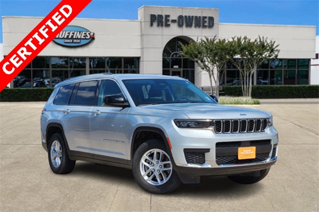 Clean CARFAX. Silver Zynith 2023 Jeep Grand Cherokee L Laredo Laredo 8-Speed Automatic 3.6L V6 24V VVT 4WD Quick Order Package 23A Laredo, 3.45 Rear Axle Ratio, 3rd row seats: split-bench, 4-Wheel Disc Brakes, 6 Speakers, ABS brakes, Air Conditioning, Alloy wheels, Anti-whiplash front head restraints, Automatic temperature control, Brake assist, Bumpers: body-color, Cloth Seats, Compass, Delay-off headlights, Driver door bin, Driver vanity mirror, Dual front impact airbags, Dual front side impact airbags, Electronic Stability Control, Emergency communication system, Four wheel independent suspension, Front anti-roll bar, Front Bucket Seats, Front Center Armrest w/Storage, Front dual zone A/C, Front License Plate Bracket, Front reading lights, Fully automatic headlights, Heated door mirrors, Illuminated entry, Knee airbag, Low tire pressure warning, Manual Fold Seatbacks, Molded In Color Black/Gloss Black Roof Rails, Normal Duty Suspension, Occupant sensing airbag, Outside temperature display, Overhead airbag, Overhead console, Panic alarm, ParkView Rear Back-Up Camera, Passenger door bin, Passenger vanity mirror, Power door mirrors, Power driver seat, Power steering, Power windows, Radio data system, Radio: Uconnect 5 w/8.4" Display, Rear air conditioning, Rear anti-roll bar, Rear reading lights, Rear window defroster, Rear window wiper, Reclining 3rd row seat, Remote keyless entry, Security system, Speed control, Speed-Sensitive Wipers, Split folding rear seat, Spoiler, Steering wheel mounted audio controls, Tachometer, Telescoping steering wheel, Tilt steering wheel, Traction control, Trip computer, Variably intermittent wipers, Voltmeter, and Wheels: 18" x 8.0" Fully Painted Aluminum.