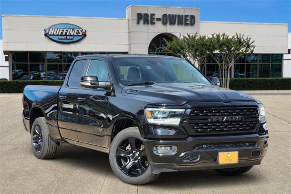 Certified. CARFAX One-Owner. Clean CARFAX. Diamond Black Crystal Pearlcoat 2022 Ram 1500 Big Horn/Lone Star Big Horn/Lone Star 8-Speed Automatic HEMI 5.7L V8 Multi Displacement VVT RWD Bed Utility Group (MOPAR 4 Adjustable Cargo Tie-Down Hooks, MOPAR Deployable Bed Step, MOPAR Spray In Bedliner, and Pick-Up Box Lighting), Big Horn Level 2 Equipment Group (115V Auxiliary Power Outlet, 115V Auxiliary Rear Power Outlet, 400W Inverter, 4G LTE Wi-Fi Hot Spot, 8.4" Touchscreen Display, Air Conditioning ATC w/Dual Zone Control, Apple CarPlay, Auto-Dimming Exterior Driver Mirror, Auto-Dimming Rear-View Mirror, Black Exterior Mirrors, Black Premium Power Mirrors, Bluetooth Handsfree Phone & Audio, Class IV Receiver Hitch, Cluster 7.0" TFT Color Display, Connectivity - US/Canada, Convex Wide-Angle Mirror Insert, Exterior Mirrors Courtesy Lamps, Exterior Mirrors w/Heating Element, Exterior Mirrors w/Supplemental Signals, For Details, Visit DriveUconnect.com, For More Info, Call 800-643-2112, Global Telematics Box Module (TBM), Glove Box Lamp, Google Android Auto, GPS Antenna Input, Heated Front Seats, Heated Steering Wheel, Integrated Center Stack Radio, Media Hub w/2 Charge Only USBs, ParkSense Front/Rear Park Assist w/Stop, Power 2-Way Driver Lumbar Adjust, Power 8-Way Driver Seat, Power Adjustable Pedals, Power-Folding Mirrors, Radio: Uconnect 5 W w/8.4" Display, Rear Dome w/On/Off Switch Lamp, Rear Power Sliding Window, Rear Window Defroster, Remote Start System, Security Alarm, SiriusXM Radio Service, SiriusXM Satellite Radio, Sun Visors w/Illuminated Vanity Mirrors, Universal Garage Door Opener, and USB Host Flip), Level 1 Safety Group (Advanced Brake Assist, Full Speed Forward Collision Warning Plus, Lane Keep Assist, and Pedestrian Emergency Braking), Night Edition (3 Rear Seat Head Restraints, 4 Way Front Headrests, Accent Color Premium Power Mirrors, Anti-Spin Differential Rear Axle, Black Exterior Truck Badging, Black Headlamp Bezels, Black Interior Accents, Black Painted Exterior Mirrors Caps, Body Color Front Bumper, Body Color Rear Bumper w/Step Pads, Bucket Seats, Delete LED Lamp - Floor Console Bin, Deluxe Cloth Bucket Seats, Dual Exhaust w/Black Tips, Front Seat Back Map Pockets, Full Length Floor Console, Manual Adjust 4-Way Front Passenger Seat, Rear 60/40 Folding Seat, and Wheels: 20" x 9.0" Premium Paint/Polished), Premium Lighting Group (Front LED Fog Lamps, LED Reflector Headlamps, and LED Taillamps), Quick Order Package 23R Lone Star (Regional) (Lone Star Badge), Quick Order Package 27R Lone Star (Regional), FCA US LLC Certified Pre-Owned Certified, 3.21 Rear Axle Ratio, 33 Gallon Fuel Tank, 4-Wheel Disc Brakes, 48V Belt Starter Generator, 6 Speakers, ABS brakes, Air Conditioning, All R1 High Radios, All Radio Equipped Vehicles, Alloy wheels, AM/FM radio, Brake assist, Bumpers: chrome, Cloth Bench Seat, Compass, Connected Travel & Traffic Services, Delay-off headlights, Disassociated Touchscreen Display, Driver door bin, Dual front impact airbags, Dual front side impact airbags, Electronic Stability Control, Emergency communication system: SiriusXM Guardian, Front anti-roll bar, Front Center Armrest w/Storage, Front fog lights, Front License Plate Bracket, Front reading lights, Front wheel independent suspension, Fully automatic headlights, GPS Navigation, HD Radio, Heated door mirrors, Illuminated entry, Integrated Voice Command w/Bluetooth, Leather steering wheel, Low tire pressure warning, Manufacturer's Statement of Origin, MOPAR Front & Rear Rubber Floor Mats, Occupant sensing airbag, Outside temperature display, Overhead airbag, Overhead console, Panic alarm, ParkView Rear Back-Up Camera, Passenger door bin, Passenger vanity mirror, Power door mirrors, Power steering, Power windows, Radio data system, Radio: Uconnect 3 w/5" Display, Radio: Uconnect 5 Nav w/8.4" Display, Rear anti-roll bar, Rear seat center armrest, Rear step bumper, Remote keyless entry, SiriusXM w/360L, Speed control, Split folding rear sea